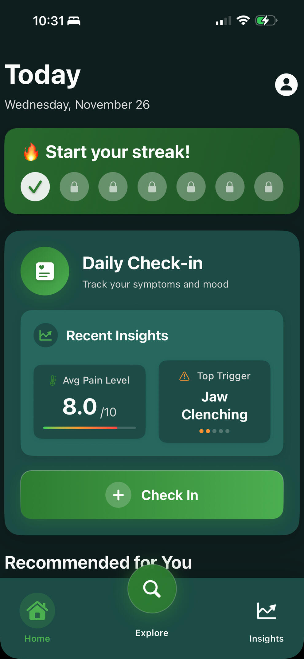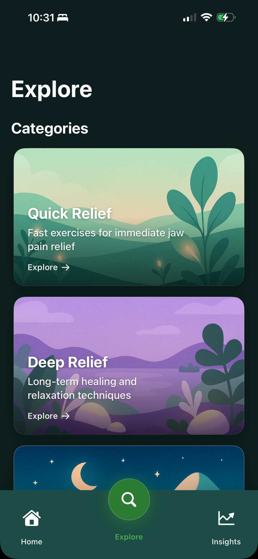Take control of your TMJ pain with personalized sessions, symptom tracking, and tailored insights right from your phone.